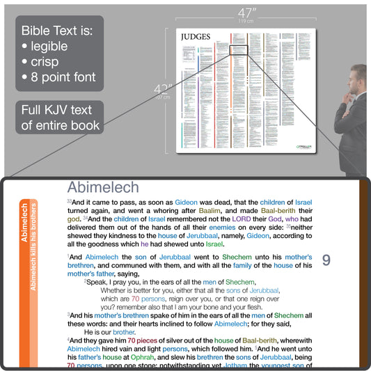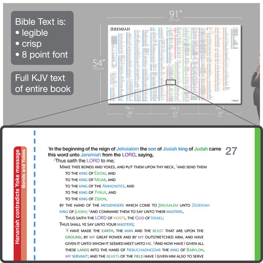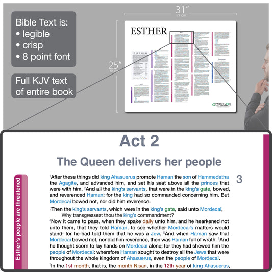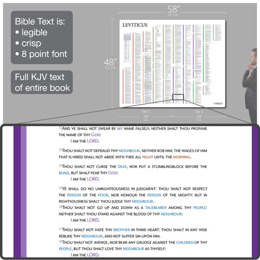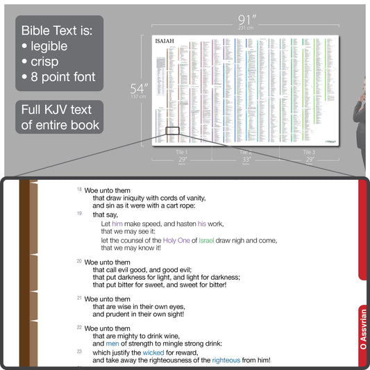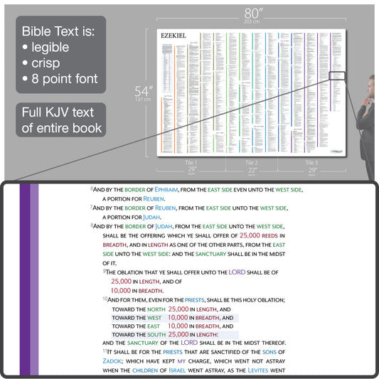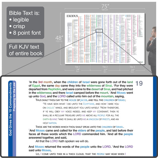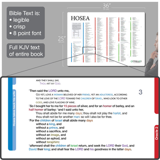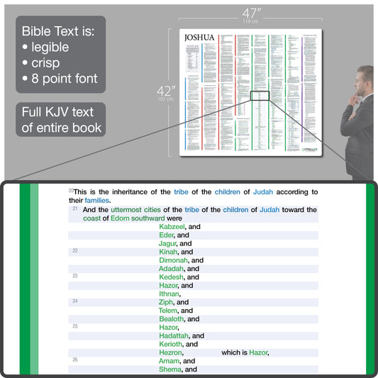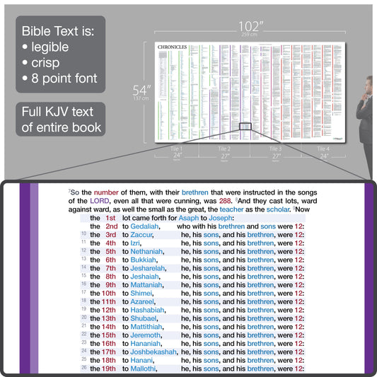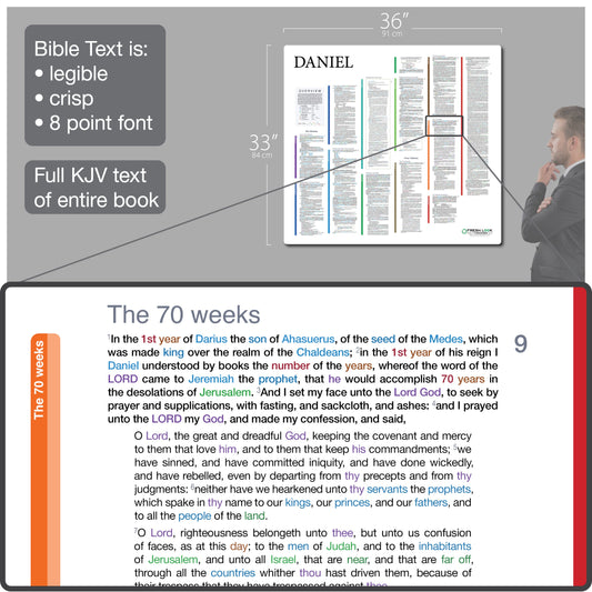 Fresh Look Bible Printed Panoramas are entire books of the Bible printed on one page. They make for uniquely visual tools for study, visual aides for teaching, and meaningful Bible art for display. The standard material is on PVC at an 8 point font, but with our own print shop, we can accommodate custom materials and sizes upon request. Shipping is included in the continental US.