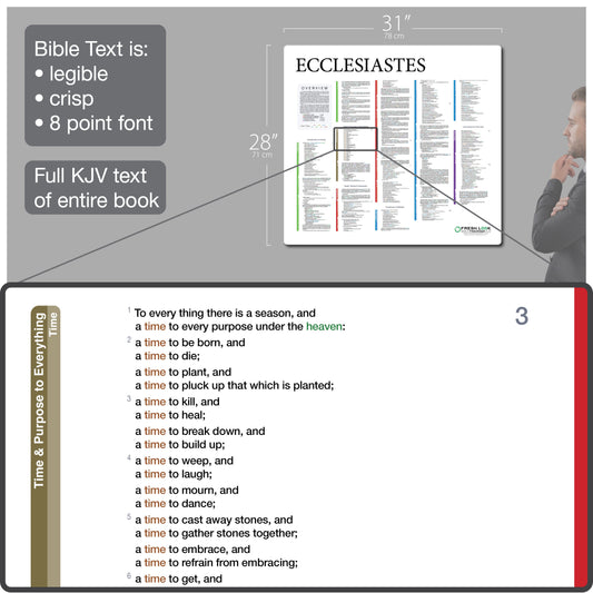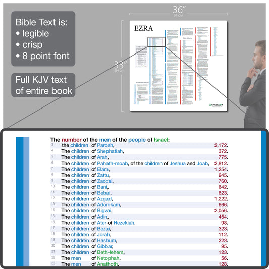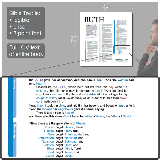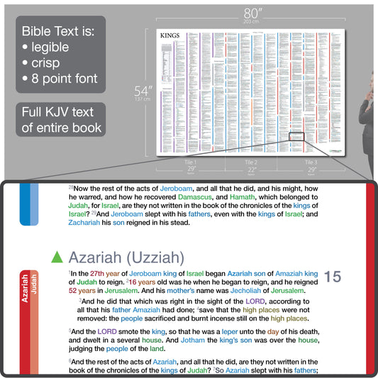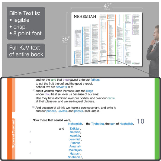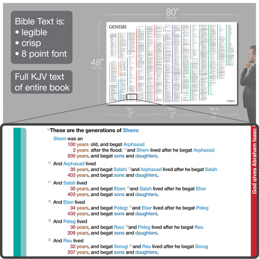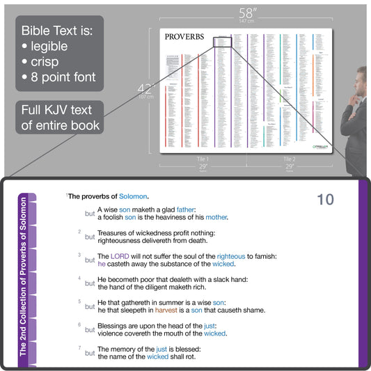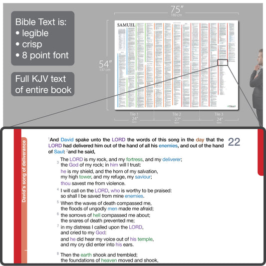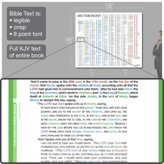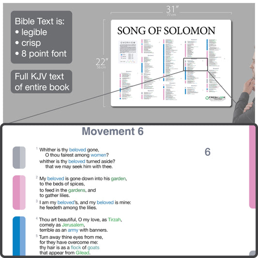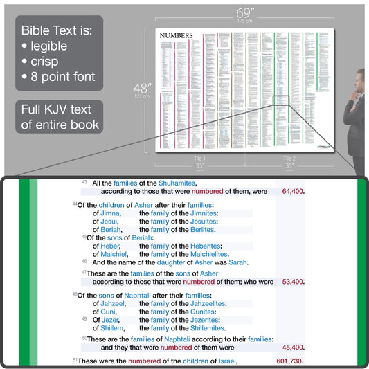 Fresh Look Bible Printed Panoramas are entire books of the Bible printed on one page. They make for uniquely visual tools for study, visual aides for teaching, and meaningful Bible art for display. The standard material is on PVC at an 8 point font, but with our own print shop, we can accommodate custom materials and sizes upon request. Shipping is included in the continental US.