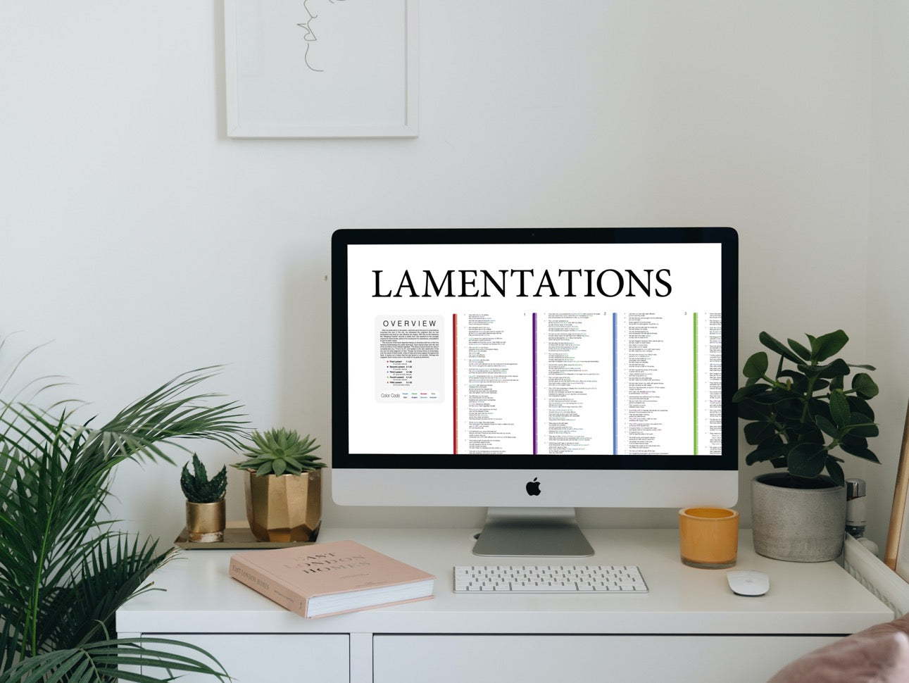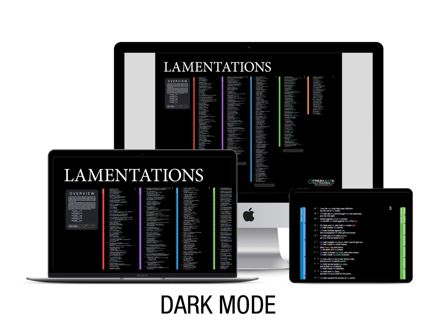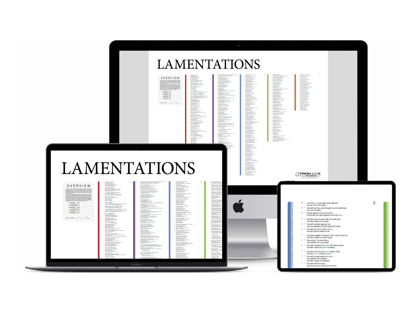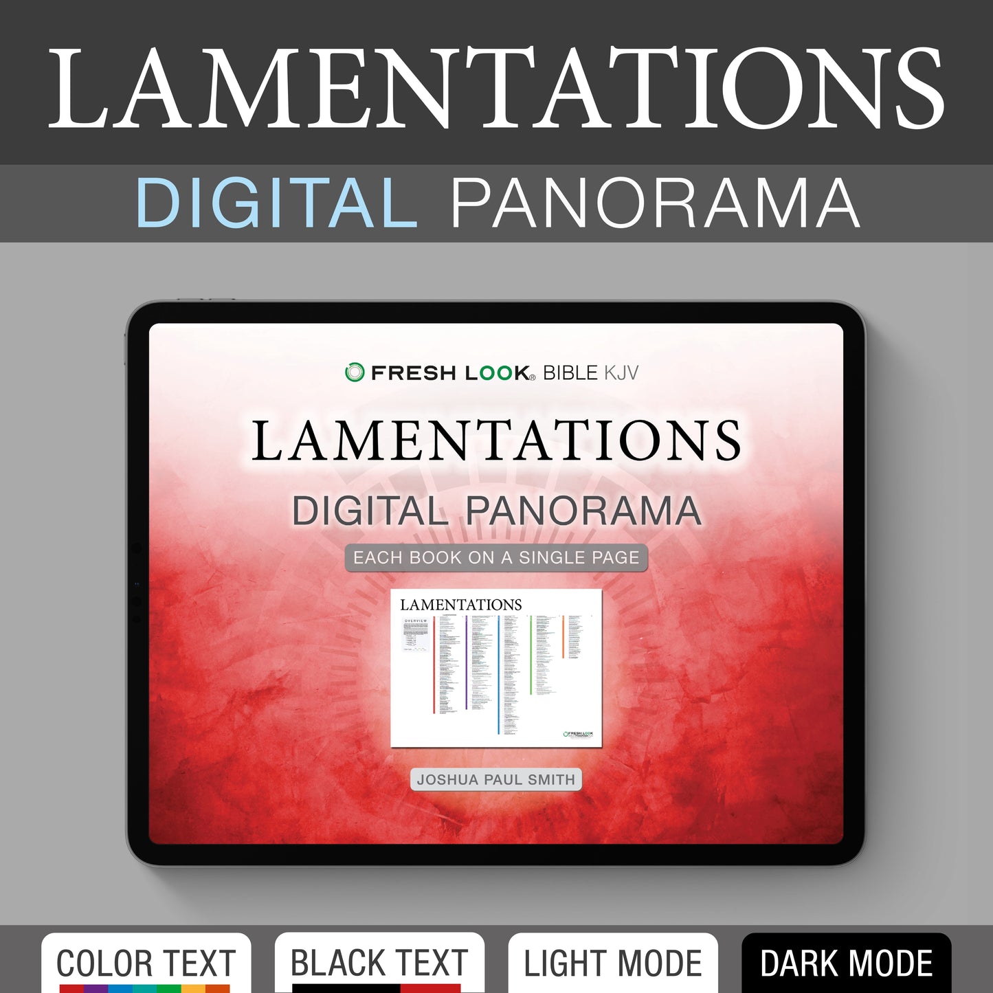 - A full resolution, interactive digital PDF document of every word of the entire book of Lamentations (KJV) displayed beautifully in its natural context.