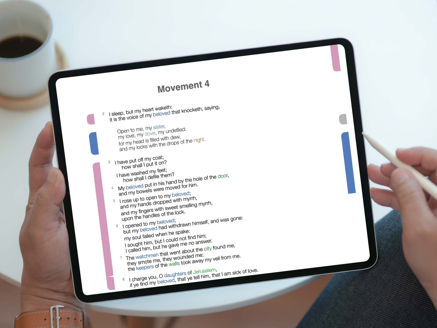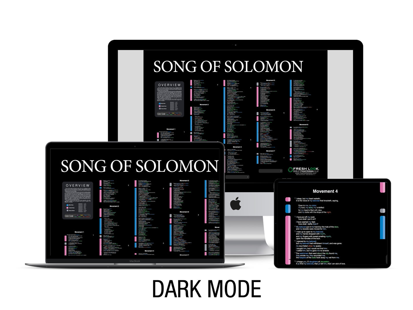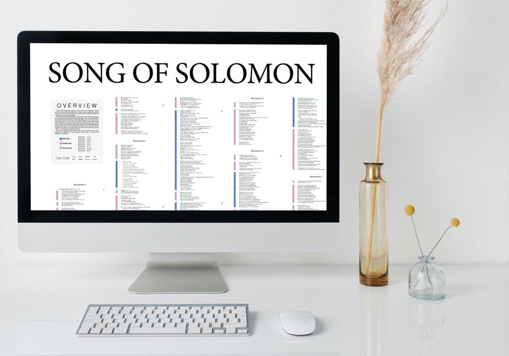 - Special formatting and color codes help you see the movements and voices of Solomon's greatest song.